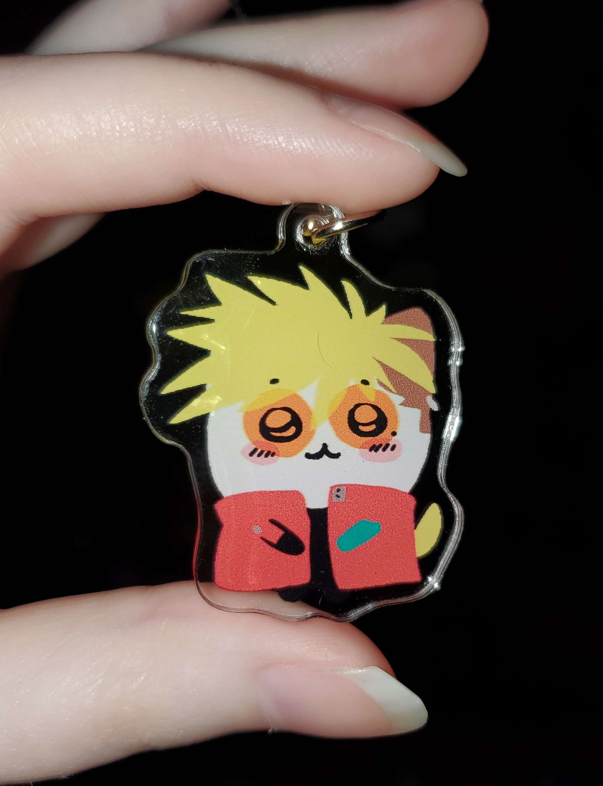 1.5" acrylic charm with double sided design and a phone strap attachment. These have a plastic film over them to protect them during shipping. Remove it to get a better quality image.